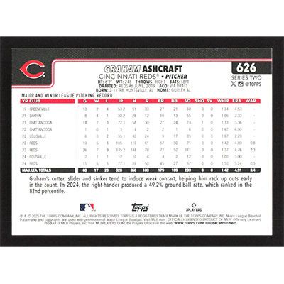 This is a 2025 Topps Graham Ashcraft baseball card. The card is #626 and pictures show condition.