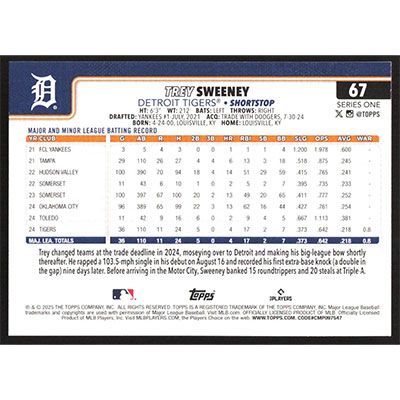 This is a 2025 Topps Trey Sweeney baseball card. The card is #67 and pictures show condition.