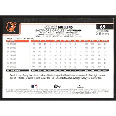 This is a 2025 Topps Cedric Mullins baseball card. The card is #69 and pictures show condition.