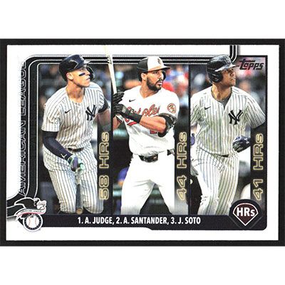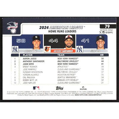 This is a 2025 Topps Aaron Judge, Anthony Santander and Juan Soto League Leaders baseball card. The card is #79 and pictures show condition. Team(s): New York Yankees/Baltimore Orioles