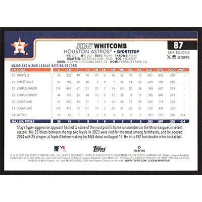 This is a 2025 Topps Shay Whitcomb baseball card. The card is #87 and pictures show condition.