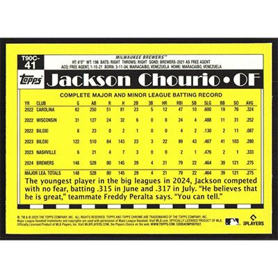 This is a 2025 Topps '90 Silver Pack Chrome Jackson Chourio baseball card. The card is #T90C-41 and pictures show condition.