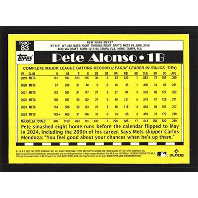 This is a 2025 Topps '90 Silver Pack Chrome Pete Alonso baseball card. The card is #T90C-83 and pictures show condition.