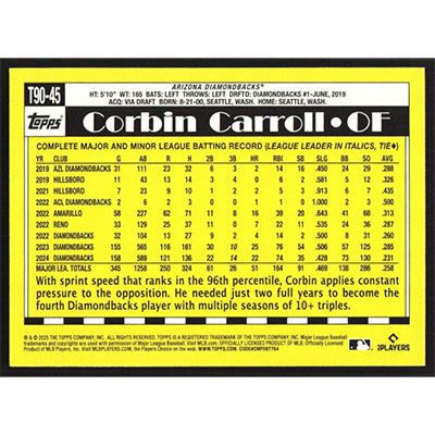 This is a 2025 Topps '90 Corbin Carroll baseball card. The card is #T90-45 and pictures show condition.
