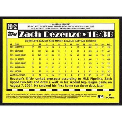 This is a 2025 Topps '90 Zach Dezenzo baseball card. The card is #T90-92 and pictures show condition.