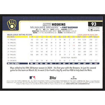 This is a 2025 Topps Rhys Hoskins baseball card. The card is #93 and pictures show condition.