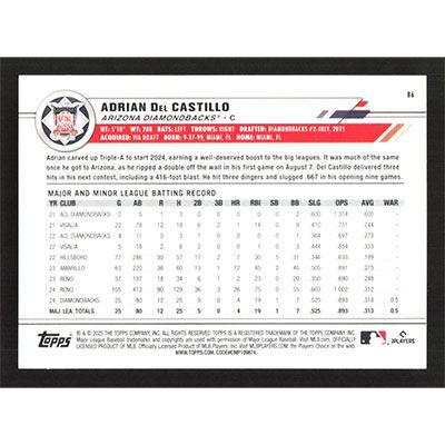 This is a 2025 Topps All-Star Game Adrian Del Castillo baseball card. The card is #86 and pictures show condition. Team(s): Arizona Diamondbacks Rookie Card (RC)