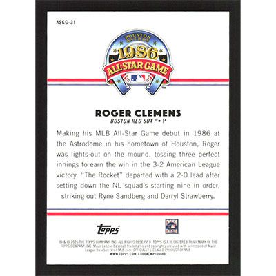 This is a 2025 Topps All-Star Game All-Star Greats Roger Clemens baseball card. The card is #ASGG-31 and pictures show condition.