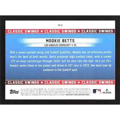 This is a 2025 Topps All-Star Game Classic Swings Mookie Betts baseball card. The card is #CS-2 and pictures show condition. Team(s): Los Angeles Dodgers