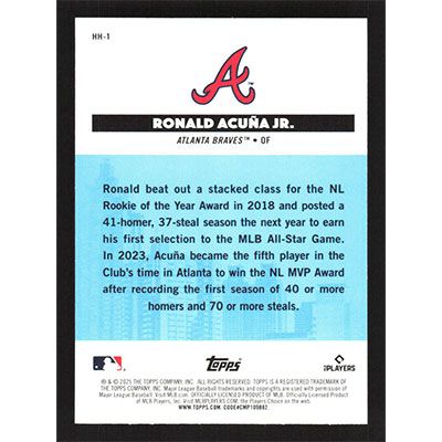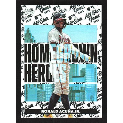 This is a 2025 Topps All-Star Game Homegrown Heroes Ronald Acuña Jr. baseball card. The card is #HH-1 and pictures show condition. Team(s): Atlanta Braves