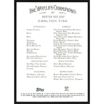 This is a 2025 Topps Allen & Ginter Carlton Fisk baseball card. The card is #187 and pictures show condition.