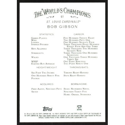 This is a 2025 Topps Allen & Ginter Bob Gibson baseball card. The card is #61 and pictures show condition.