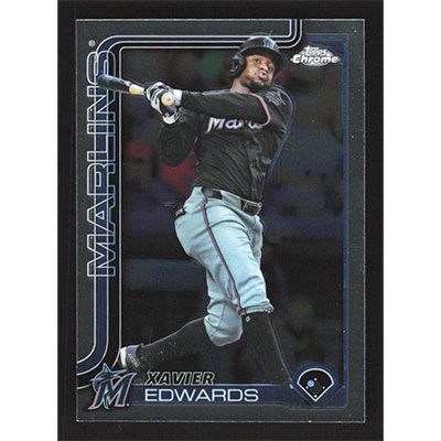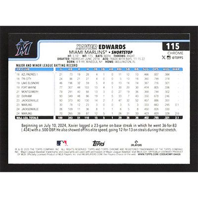 This is a 2025 Topps Chrome Xavier Edwards baseball card. The card is #115 and pictures show condition.