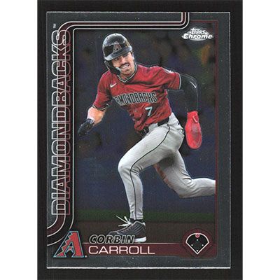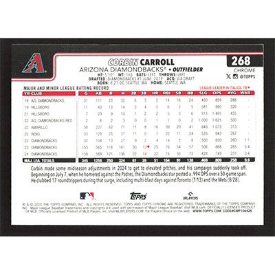 This is a 2025 Topps Chrome Corbin Carroll baseball card. The card is #268 and pictures show condition.