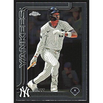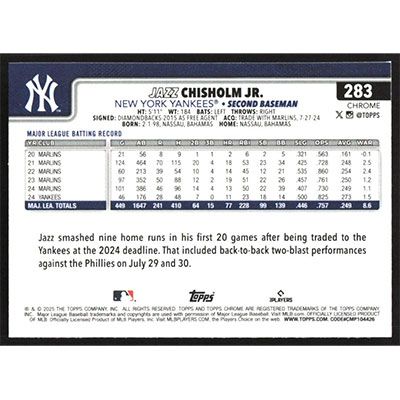 This is a 2025 Topps Chrome Jazz Chisholm Jr. baseball card. The card is #283 and pictures show condition.
