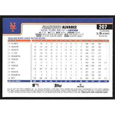 This is a 2025 Topps Chrome Refractors Francisco Alvarez baseball card. The card is #207 and pictures show condition.