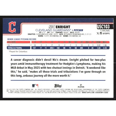 This is a 2025 Topps Chrome Update RayWave Refractors Nic Enright baseball card. The card is #USC103 and pictures show condition. Team(s): Cleveland Guardians Rookie Card (RC)