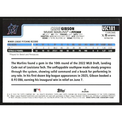This is a 2025 Topps Chrome Update Refractors Cade Gibson baseball card. The card is #USC181 and pictures show condition. Team(s): Miami Marlins Rookie Card (RC)
