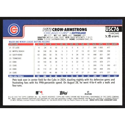 This is a 2025 Topps Chrome Update Sepia Refractors Pete Crow-Armstrong baseball card. The card is #USC76 and pictures show condition. Team(s): Chicago Cubs
