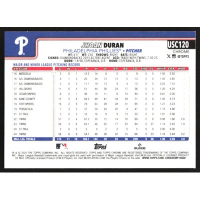 This is a 2025 Topps Chrome Update Jhoan Duran baseball card. The card is #USC120 and pictures show condition.