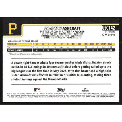 This is a 2025 Topps Chrome Update Braxton Ashcraft baseball card. The card is #USC142 and pictures show condition. Team(s): Pittsburgh Pirates Rookie Card (RC)