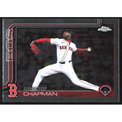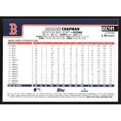 This is a 2025 Topps Chrome Update Aroldis Chapman baseball card. The card is #USC191 and pictures show condition.