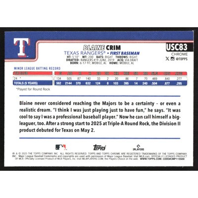 This is a 2025 Topps Chrome Update Blaine Crim baseball card. The card is #USC83 and pictures show condition. Team(s): Texas Rangers Rookie Card (RC)