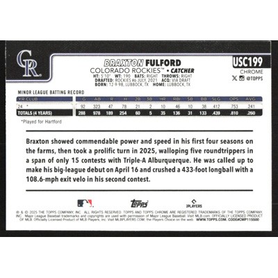 This is a 2025 Topps Chrome Update X-Fractors Braxton Fulford baseball card. The card is #USC199 and pictures show condition. Team(s): Colorado Rockies Rookie Card (RC)