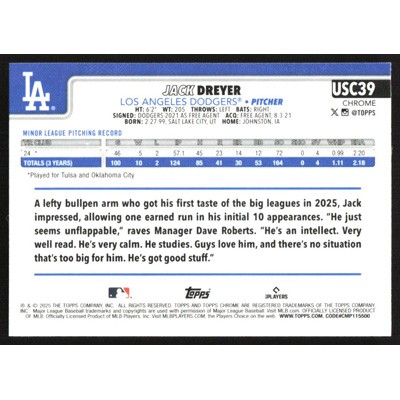 This is a 2025 Topps Chrome Update X-Fractors Jack Dreyer baseball card. The card is #USC39 and pictures show condition. Team(s): Los Angeles Dodgers Rookie Card (RC)