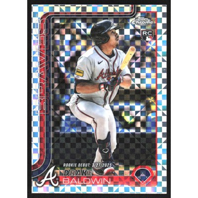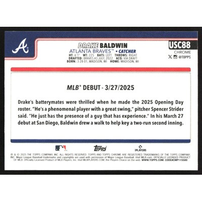 This is a 2025 Topps Chrome Update X-Fractors Drake Baldwin Rookie Debut baseball card. The card is #USC88 and pictures show condition. Team(s): Atlanta Braves Rookie Card (RC)