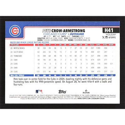 This is a 2025 Topps Holiday Gold Lights Pete Crow-Armstrong baseball card. The card is #H41 and pictures show condition.