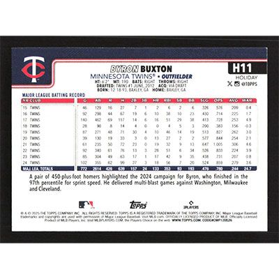 This is a 2025 Topps Holiday Byron Buxton baseball card. The card is #H11 and pictures show condition.