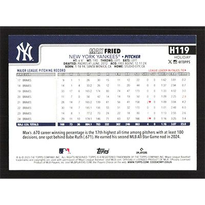 This is a 2025 Topps Holiday Max Fried baseball card. The card is #H119 and pictures show condition.