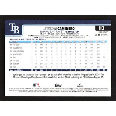 This is a 2025 Topps Holiday Junior Caminero baseball card. The card is #H3 and pictures show condition.