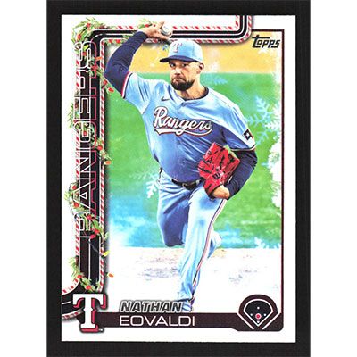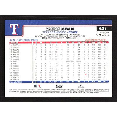 This is a 2025 Topps Holiday Nathan Eovaldi baseball card. The card is #H47 and pictures show condition.