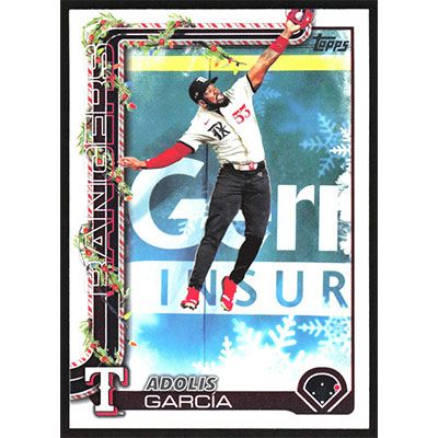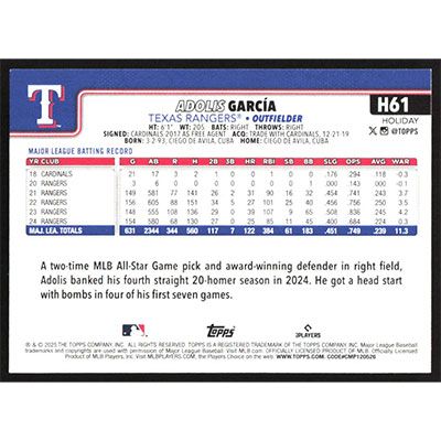 This is a 2025 Topps Holiday Adolis Garcia baseball card. The card is #H61 and pictures show condition.