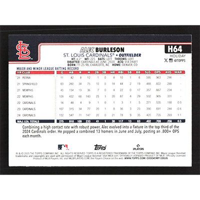 This is a 2025 Topps Holiday Alec Burleson baseball card. The card is #H64 and pictures show condition.