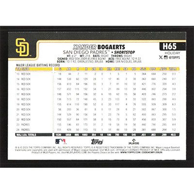 This is a 2025 Topps Holiday Xander Bogaerts baseball card. The card is #H65 and pictures show condition.