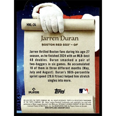 This is a 2025 Topps Holiday Making the Nice List Jarren Duran baseball card. The card is #MNL-24 and pictures show condition.