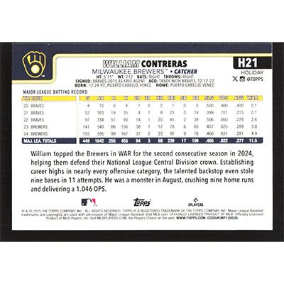 This is a 2025 Topps Holiday Silver Glitter William Contreras baseball card. The card is #H21 and pictures show condition.
