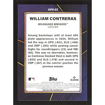 This is a 2025 Topps OPS Best William Contreras baseball card. The card is #OPS-23 and pictures show condition.