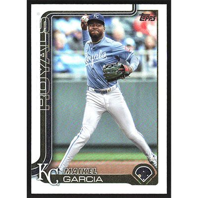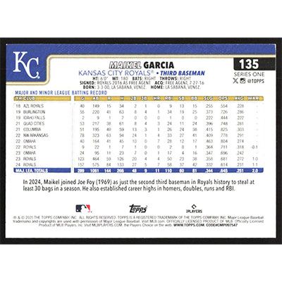 This is a 2025 Topps Rainbow Foil Maikel Garcia baseball card. The card is #135 and pictures show condition.