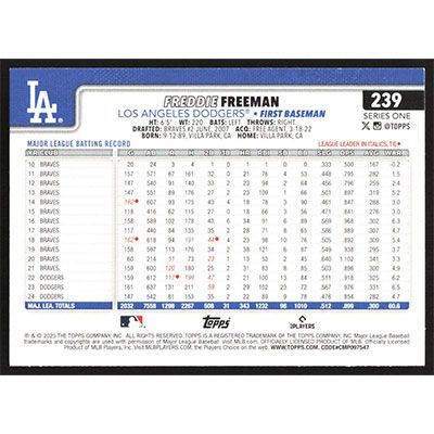 This is a 2025 Topps Sandglitter Freddie Freeman baseball card. The card is #239 and pictures show condition.