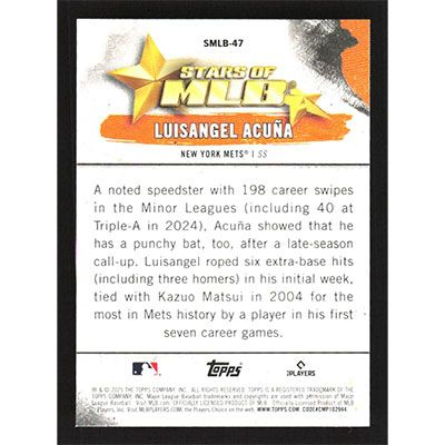 This is a 2025 Topps Stars of MLB Luisangel Acuña baseball card. The card is #SMLB-47 and pictures show condition. Team(s): New York Mets Rookie Card (RC)