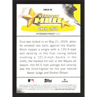 This is a 2025 Topps Stars of MLB Oneil Cruz baseball card. The card is #SMLB-50 and pictures show condition.