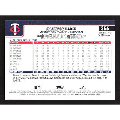 This is a 2025 Topps Sun Harrison Bader baseball card. The card is #356 and pictures show condition.