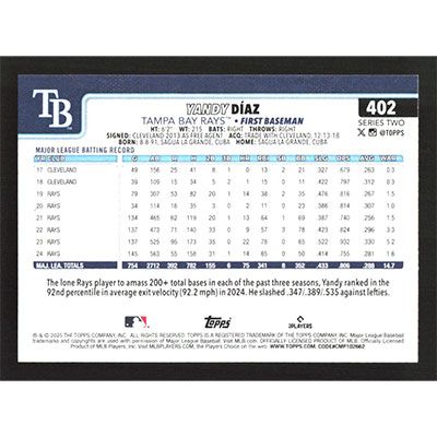 This is a 2025 Topps Sun Yandy Diaz baseball card. The card is #402 and pictures show condition.