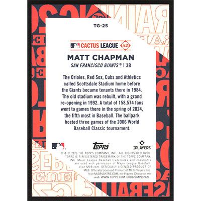 This is a 2025 Topps Training Grounds Matt Chapman baseball card. The card is #TG-25 and pictures show condition.