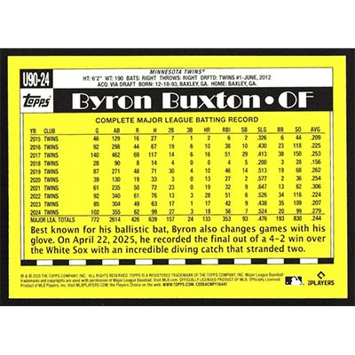 This is a 2025 Topps Update '90 Byron Buxton baseball card. The card is #U90-24 and pictures show condition.