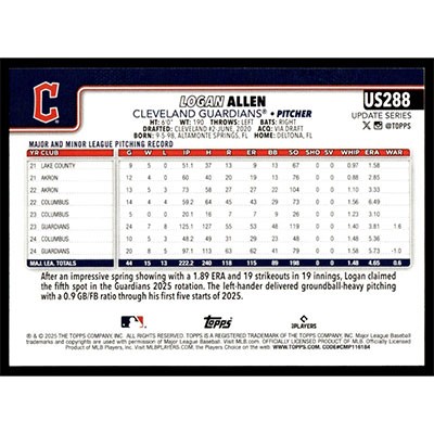 This is a 2025 Topps Update Diamante Foil Logan Allen baseball card. The card is #US288 and pictures show condition.